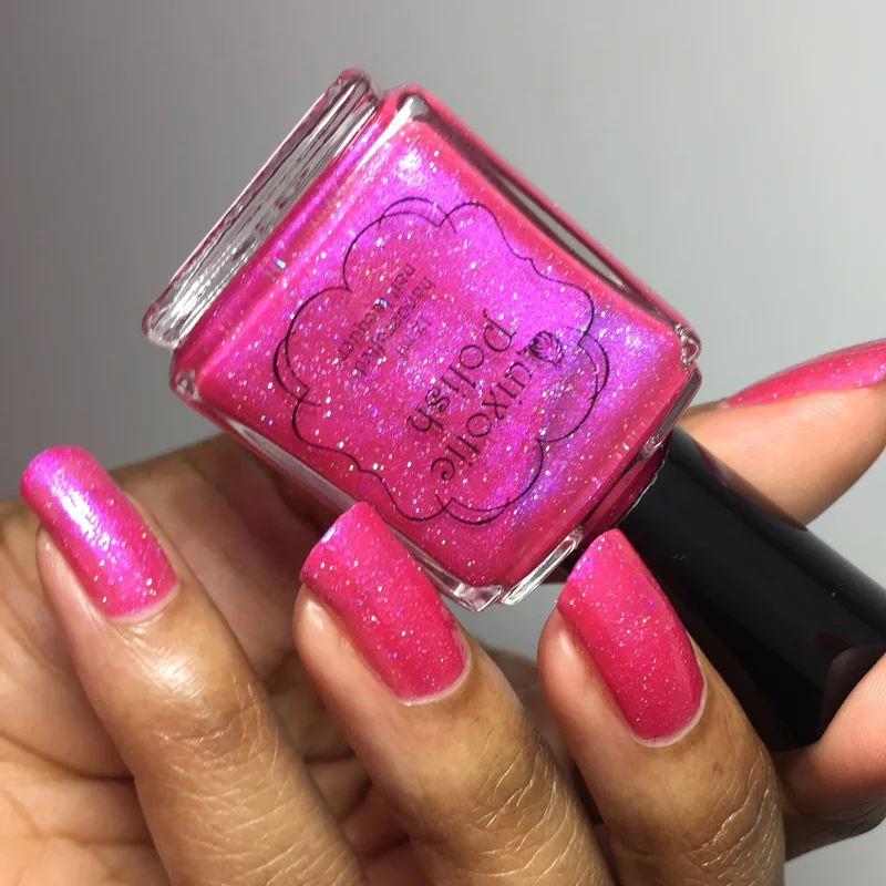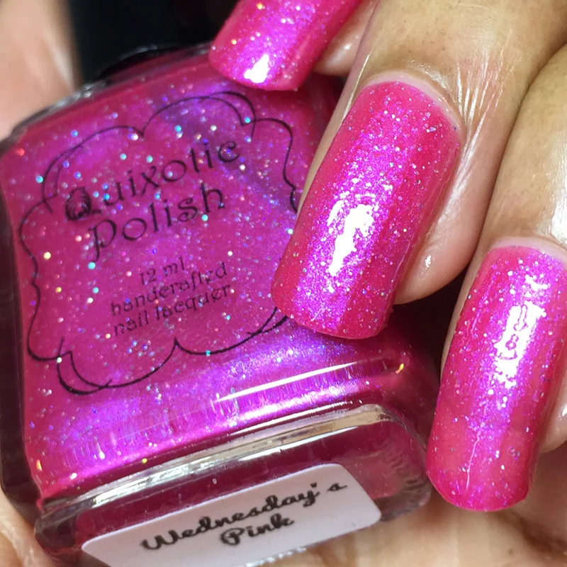 Wednesday's Pink is a squishy pink jelly with blue shimmer and holographic microglitter. As with all jelly polishes, it's somewhat sheer. Your nail line will show through, but it's easily fixed if you apply a base color first or build up multiple layers to make it more opaque. Visible nail line doesn't bother me, so I rock it as is.