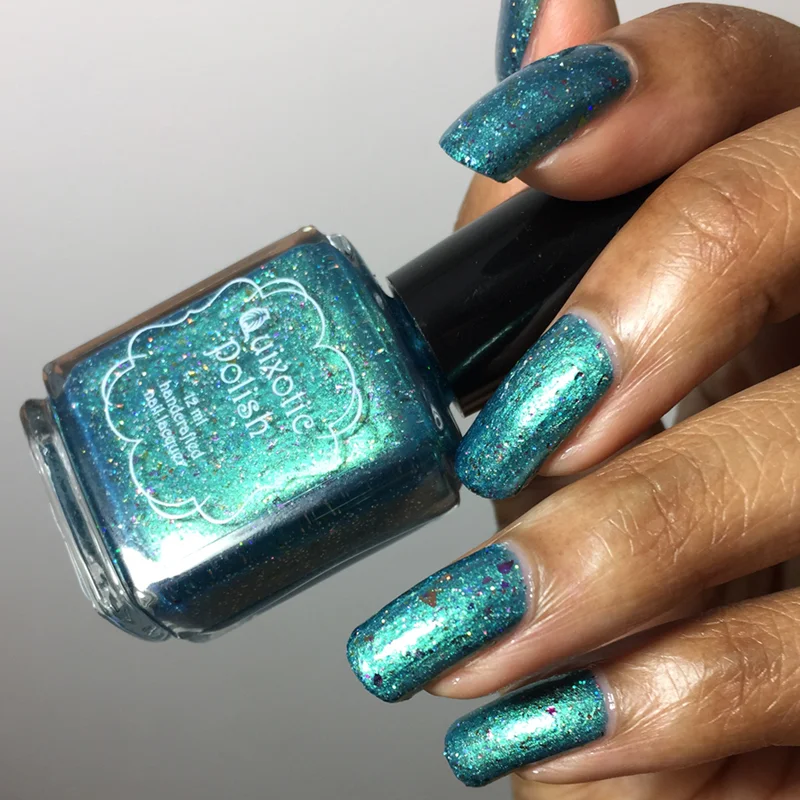 I'm starting with my favorite of the bunch. Cher's Favorite Sparkle is instant mermaid nails! It's a shimmery aqua multichrome with holographic glitter and magenta/orange/green shifting flakies.