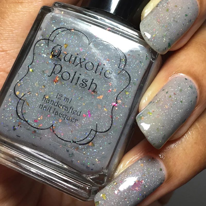 Andalusite is a stone grey jelly with UCC flakies and holographic microglitter. I love the squishiness of Quixotic's jelly formula. Andalusite applies quite sheer. In fact, the first coat was so transparent that I think you could use it as a topper if desired. I wanted the color to be more opaque, so I used three coats plus a top coat. I recommend applying a grey base color first if you want to achieve full opacity. It's a very pretty polish, but I think the color looks more muted on my skin tone. It works well as a nice neutral or office-friendly shade.